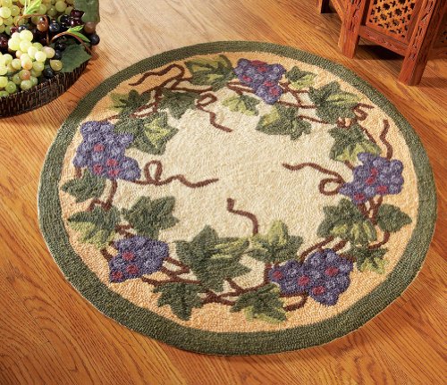 This grapevine rug is a rich addition to any kitchen, hall or entryway. Round, hand-hooked polyester design depicts a grapevine design encircled with a green border. Shake or vacuum to clean. Imported. 27"Dia....
